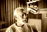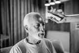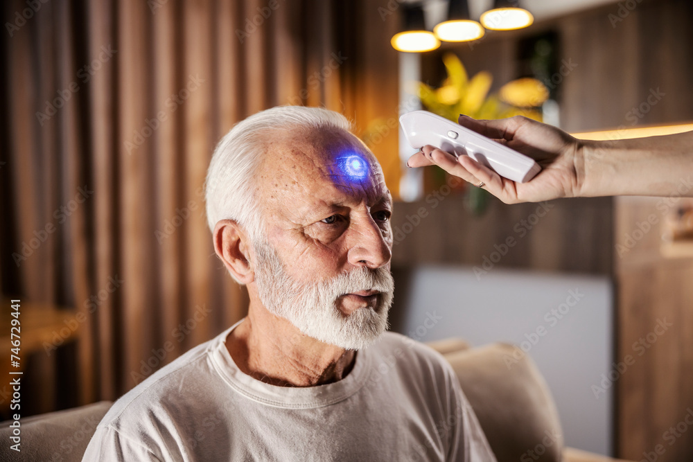 Close up of a sick senior man at sitting at home while a hand is holding digital thermometer and checking on his temperature.
