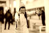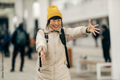 A happy japanese traveler at metro station and running into a hug.