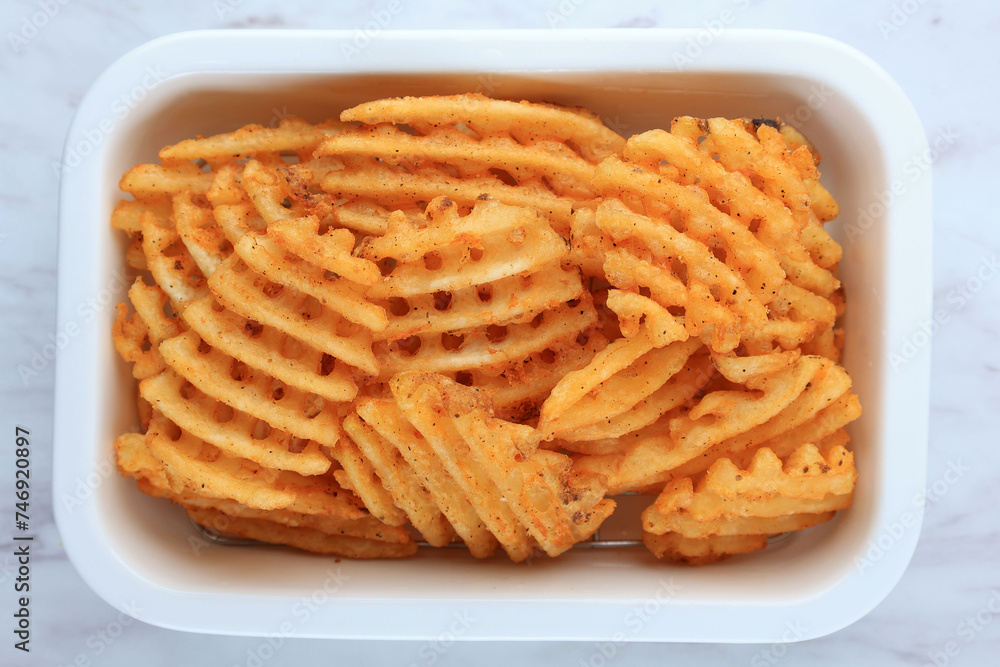 Top View Waffle Fries on White Plate