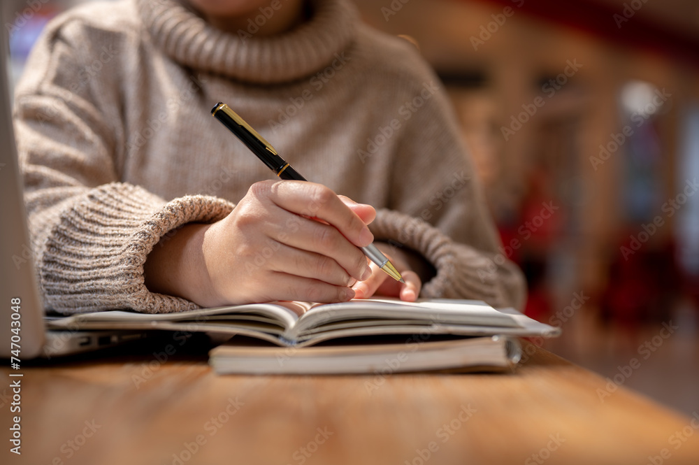 A woman in a comfy sweater is working remotely at a cafe, making list in her notebook.