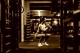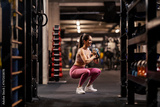 Fit sportswoman in shape is squatting with kettlebell in a gym.