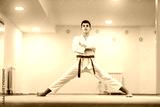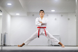 Taekwondo boy in kimono wearing red belt and posing with arms crossed.
