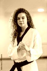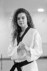 Portrait of a taekwondo girl standing in strike position and looking at the camera.