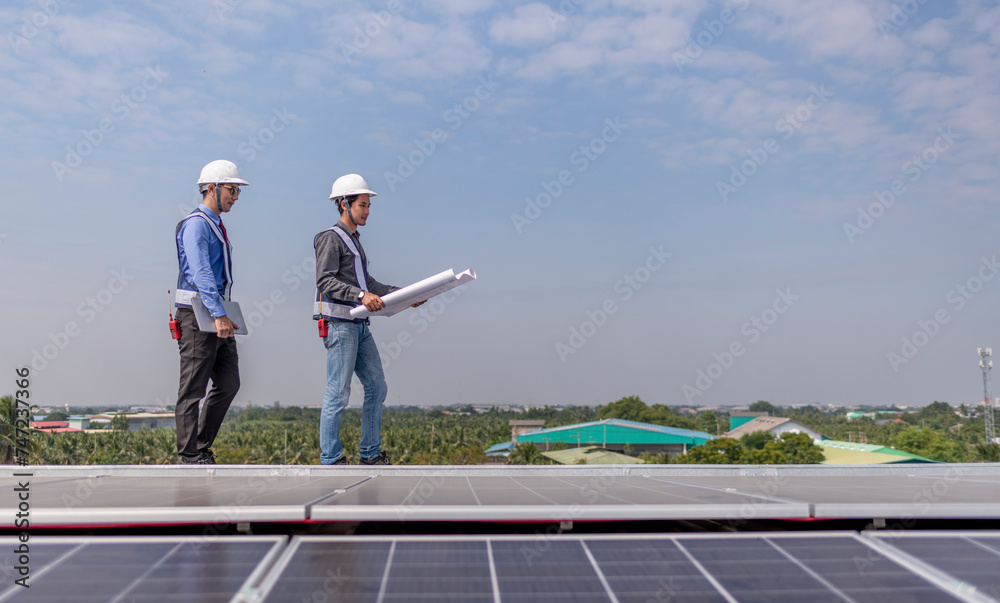 Engineers walking on factory roof inspect survey and check solar cell panel .solar cell is smart grid ecology energy sunlight alternative power factory concept.