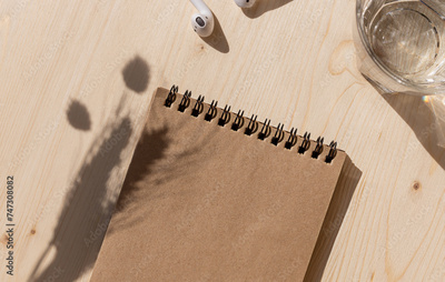 Craft paper spiral notebook with dried plants and grass on the wooden background. Copy space