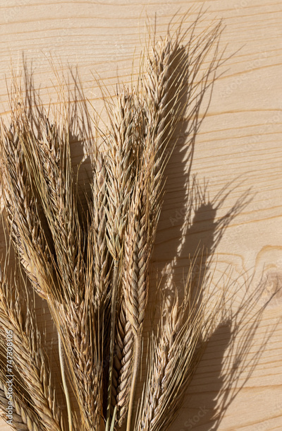 Dry wheat ears on the wooden background. Close up