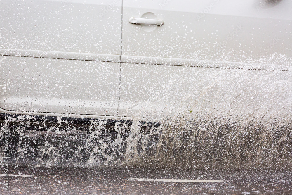 Car motion through big puddle of water splashes from the wheels on the street road.