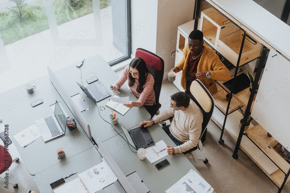 Diverse team collaborating in modern office environment.