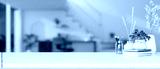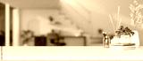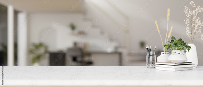 Accessories and empty space on a white tabletop with a blurred background of a modern home office.
