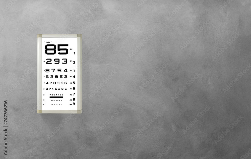 Snellen eye chart in vision clinic isolated on cement background. and text area