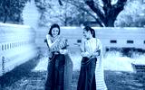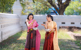 Beautiful Asian woman wearing Thai dress traditional pose happiness to playing splash water during Songkran festival is funny festival traditional holiday in Thailand .