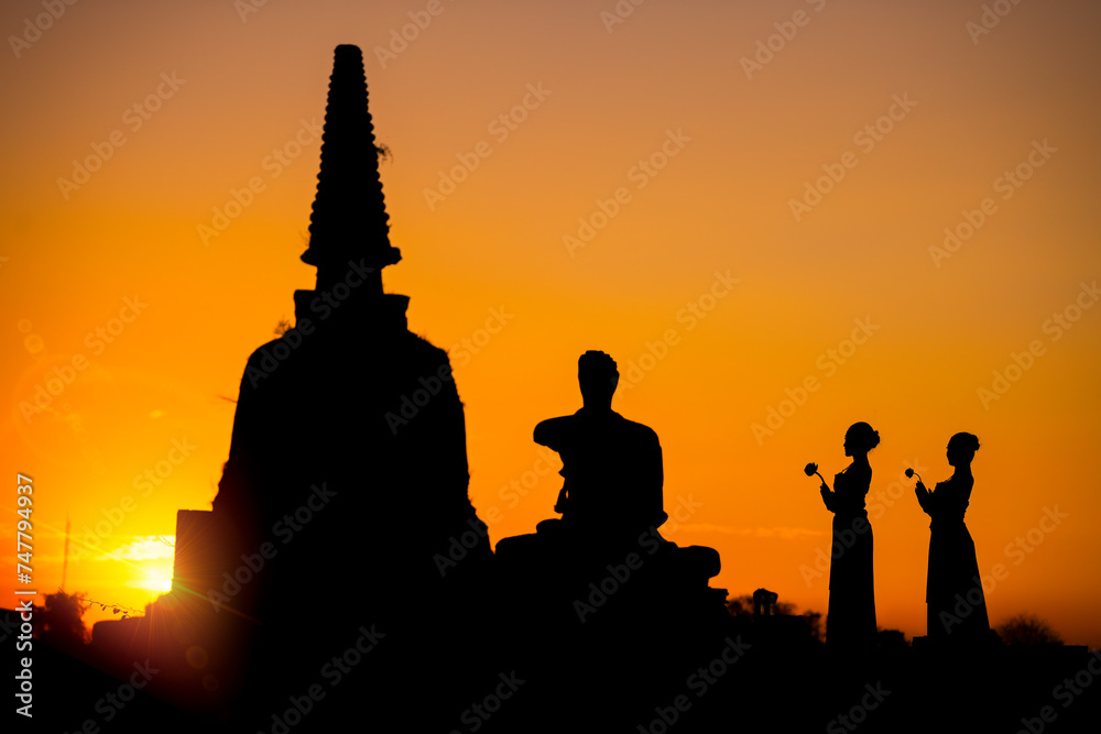 Silhouette women take flowers come to respect buddha and ancient pagoda in temple at sunset time.