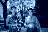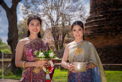 Asian woman wearing ancient Thai traditional dress holds garland and fresh flowers paying homage Buddha in temple to make a wish on the traditional Songkran festival in Thailand.