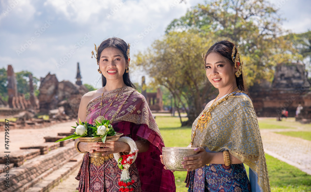 Asian woman wearing ancient Thai traditional dress holds garland and fresh flowers paying homage Buddha in temple to make a wish on the traditional Songkran festival in Thailand.