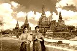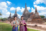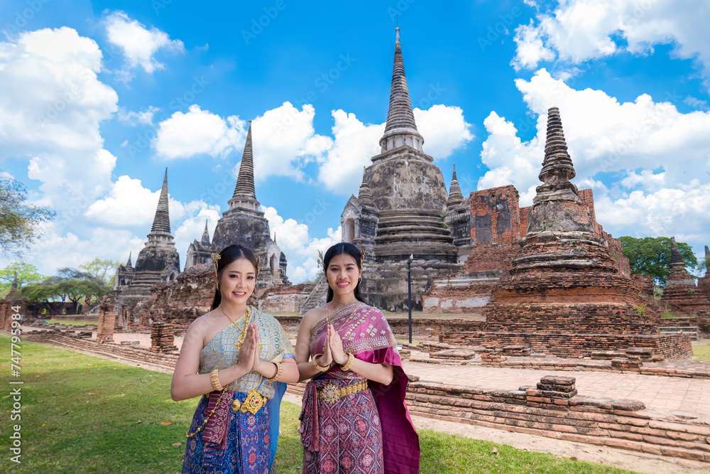 Portrait Asian model posing to pay respect with smiling wearing Thai dress traditional costume greeting happy new year thailand songkran festival