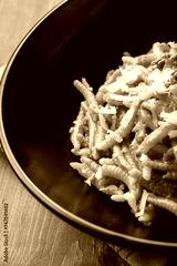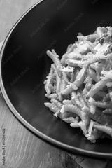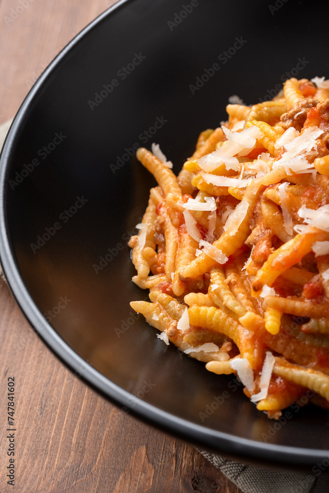 Piatto di malloreddus con sugo di carne e pecorino, cibo sardo, pasta italiana