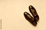 Men's accessories on yellow background. Leather brown classic shoes. Casual design, fashion concept. Flat lay, top view