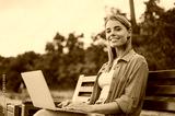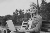 Young IT woman she wearing orange shirt casual clothes hold use work on laptop pc computer sit on bench walk rest relax in spring green city park outdoors on nature. Urban lifestyle leisure concept.