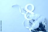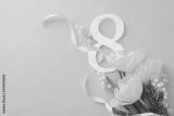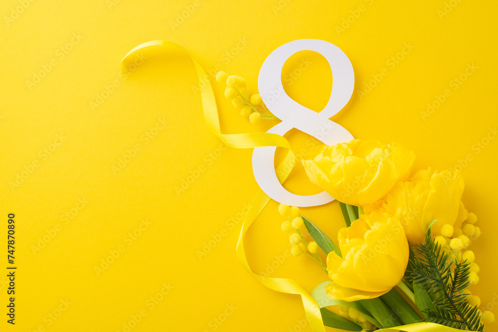 Radiant Women's Day motif. Top view photo of a generous bunch of tulips and mimosa flowers, secured with a twine, and 8 sign on a sunny yellow canvas, with space for wording or adverts