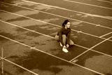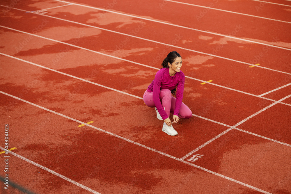A happy female runner is crouching on running track at stadium and tying her shoelace.
