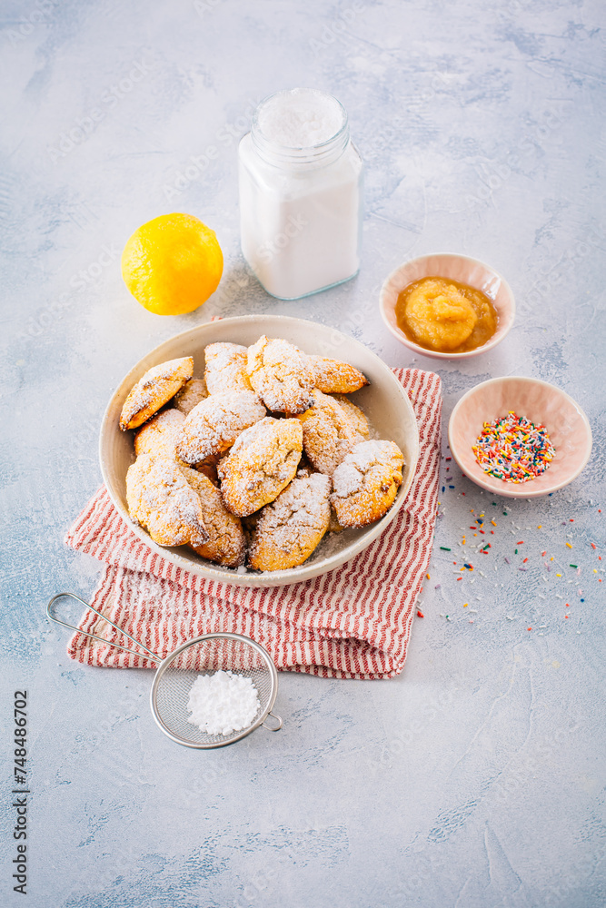 Homemade cottage cheese donuts balls with powdered sugar and apple sauce