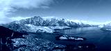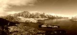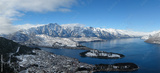 Aerial panoramic winter view of Queenstown, Lake Wakatipu and the Remarkables mountain range in the Southern Alps on New Zealand's South Island