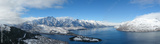 Aerial panoramic winter view of Queenstown, Lake Wakatipu and the Remarkables mountain range in the Southern Alps on New Zealand's South Island