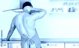 Naked man preparing food in the kitchen. View from the back.