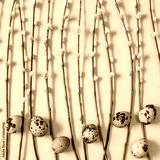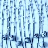 Easter composition in minimal style made of pussy willow branches with catkins and quail eggs on pink pastel background. Happy Easter, Palm Sunday concept. Flat lay, top view