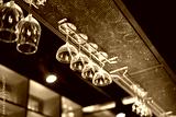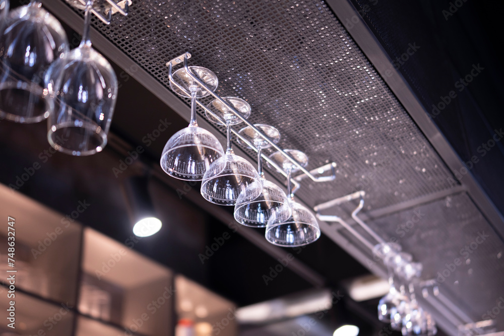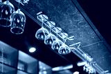 Upside Down Glassware Suspended Over a Bar Counter in Dim Lighting