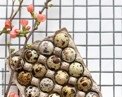 Organic farm quail eggs with spring flowers on the white ceramic tile table. Easter celebration concept top view. Copy space
