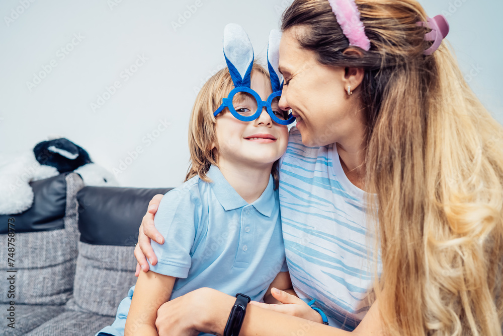 Portraits of happy smiling Caucasian mother and her son in bunny ears having fun at home on Easter day. Family sitting on sofa at home hugging, laughing. Family Easter traditions. Selective focus