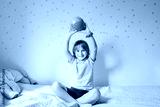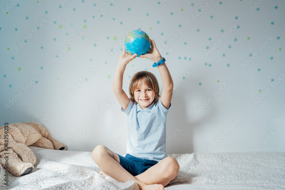 Smiling caucasian boy holding an earth globe model over his head sitting on the bed with stars background on the white wall. Save the planet, Earth Day. Future Global peace and unity concept