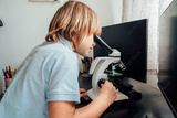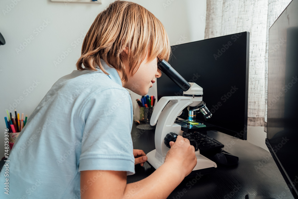 Caucasian boy using a microscope at home at his study place. Child curiosity, thirst for knowledge, home learning experience, home remote education concepts. Selective focus.