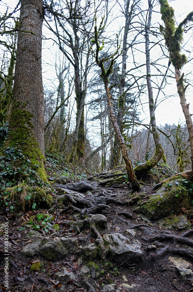 mossy undergrowth trees in mountain forest, autumn-winter season. beautiful nature background with mossy tree trunks. mystical green Mossy Forest landscape. harmony of nature.