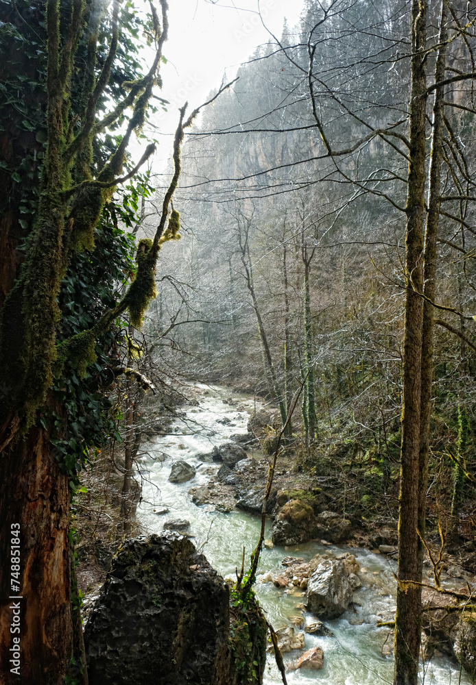 mossy undergrowth trees and river in mountain forest, autumn-winter season. beautiful nature background with mossy tree trunks. mystical green Mossy Forest landscape. harmony of nature.