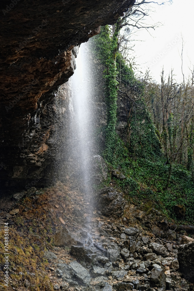 Waterfall and mossy trees in mountains, autumn-winter season. beautiful nature background with mossy tree trunks. mystical green Mossy Forest landscape. harmony of nature.