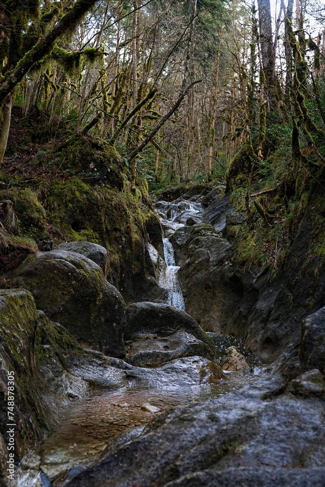 Waterfall stream and mossy stones in mountain forest, autumn-winter season. beautiful nature background. mystical green Mossy Forest landscape. harmony of nature.