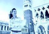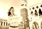 Happy young woman looking at map against campanile di san marco