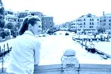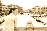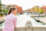 Happy young woman standing on bridge in venice, italy
