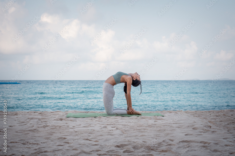 Young sport woman wearing sport suit practice yoga on the beach .Yoga is meditation and healthy sport relaxing on summer holiday with blue sea and sky background.
