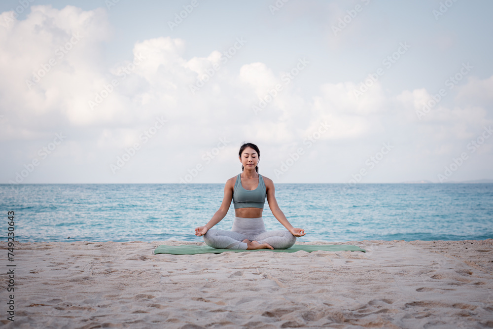 Young sport woman wearing sport suit practice yoga on the beach .Yoga is meditation and healthy sport relaxing on summer holiday with blue sea and sky background.
