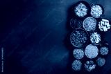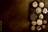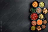 Superfoods and cereals selection in bowls: chia seeds, peas, green spirulina, goji berries and nuts, raisins, buckwheat, flax and quinoa. Free space for text.