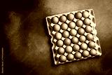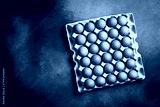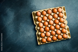 Top view, chicken eggs in a paper tray. On a gray concrete background.