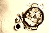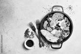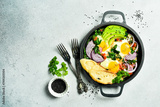Traditional Israel food Shakshuka. Fried eggs in tomato sauce. Gray concrete table. Top view. Close up