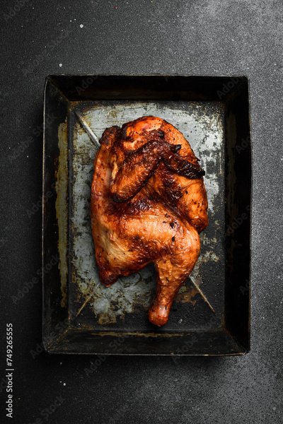 Grilled chicken on a metal tray. Barbecue. Traditional festive dish.