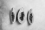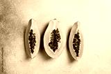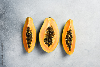 Close up of exotic papaya fruit. Sliced papaya on a gray concrete background.