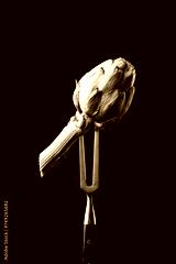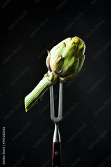 Ripe organic artichoke on a metal fork. On a black background, vertical photo.