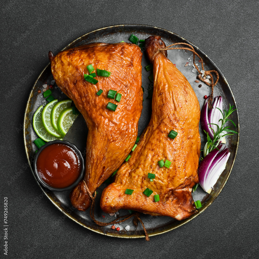 Smoked chicken legs on a black plate with lemon, rosemary and spices. On a dark background.