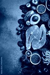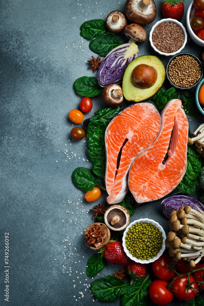 Top view, vertical photo. Healthy food clean eating selection. Superfood, fish and fruit.